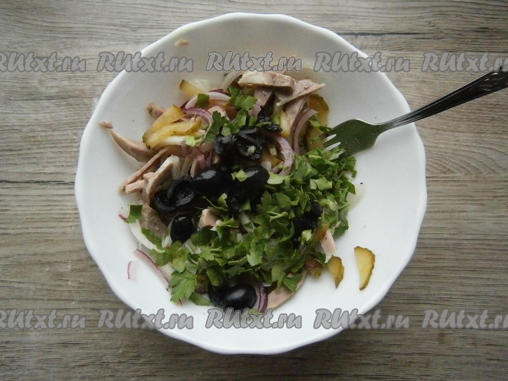 Добавить измельченную зелень петрушки и разрезанные на 2 части оливки без косточек, перемешать.