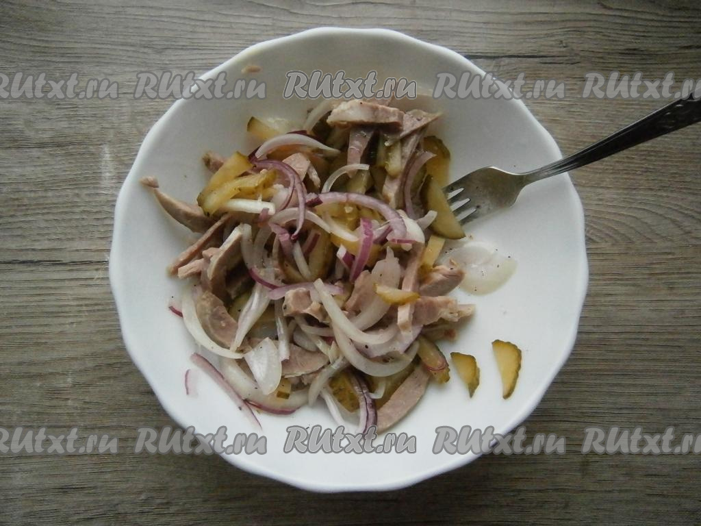 Соединить мясо и огурцы с маринованным луком, хорошо перемешать.