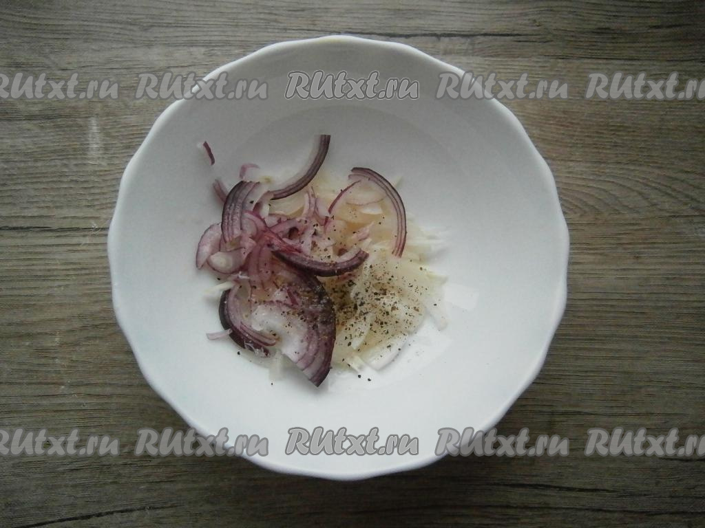 Лук очистить, нарезать тонкими полукольцами или четвертинами, добавить соль, сахар, черный перец, лимонный сок и оливковое масло, перемешать, оставить на 5-7 минут.
