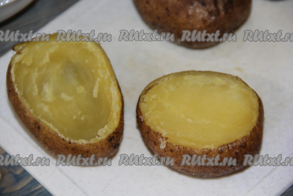 Горячий картофель переложить на разделочную доску, срезать верхушку и с помощью ложки вынуть часть мякоти. Сформировать лодочки (как на фото).