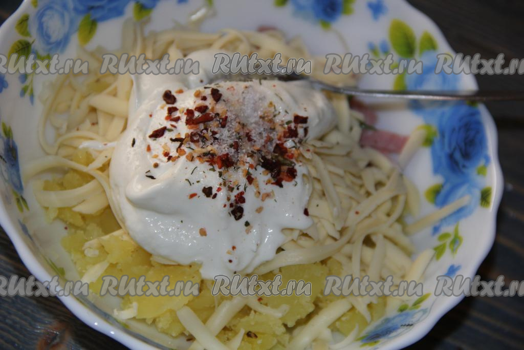 Перемешать начинку, добавить сметану и специи.