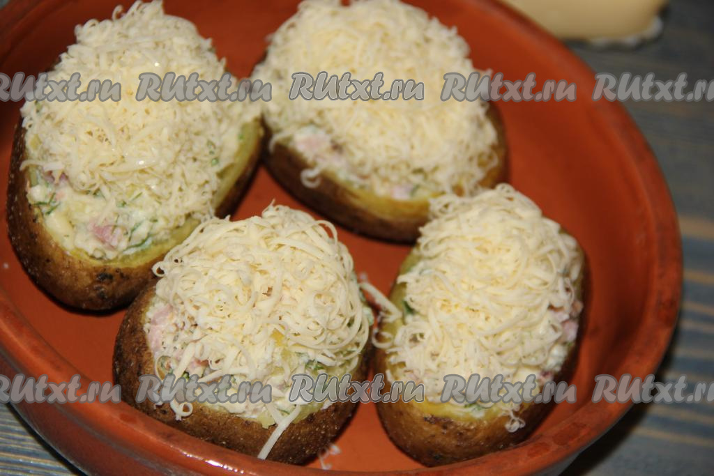 Картошку, фаршированную ветчиной и сыром, запекать в разогретой духовке при температуре 200 градусов, примерно, 15-20 минут.