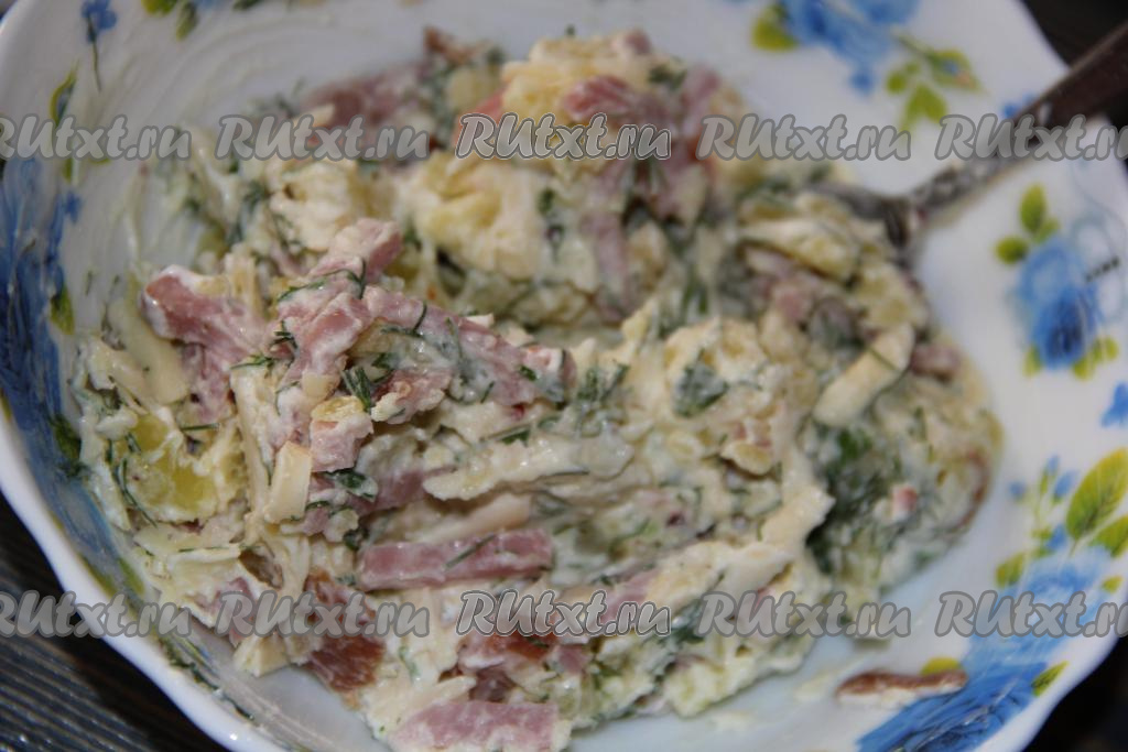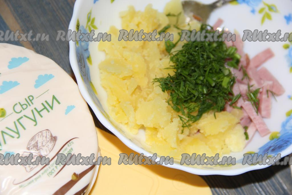 Сыр натереть на тёрке и добавить в начинку из картошки, зелени и ветчины.
