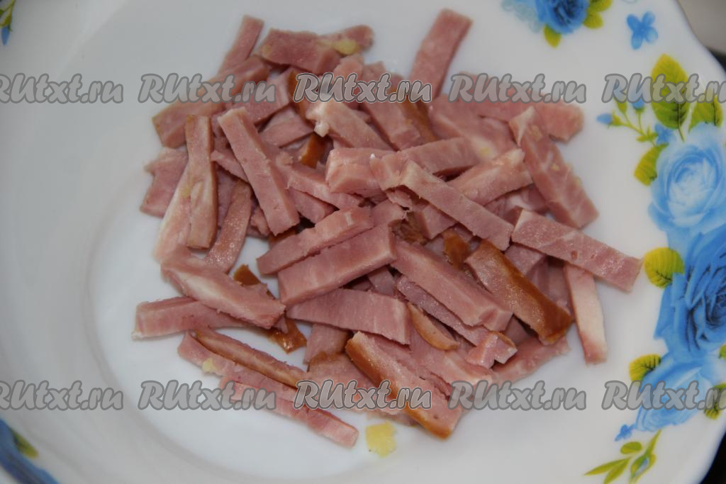 Для приготовления начинки для фарширования картошки нужно ветчину нарезать брусочками.
