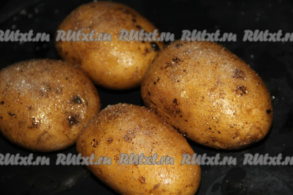 Картофель хорошо вымыть. Выложить картофелины на противень, полить растительным маслом, посолить и поперчить.