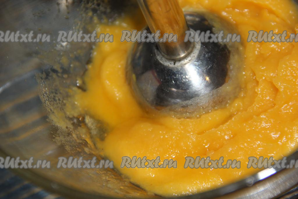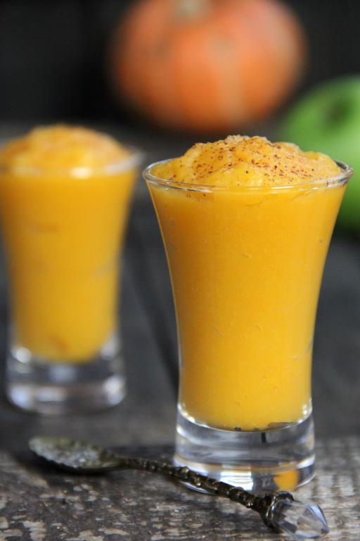 С помощью погружного блендера пюрировать яблоки и тыкву до однородного состояния. Добавить по вкусу сахарную пудру (или любой сироп).