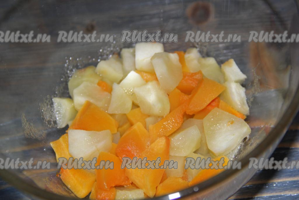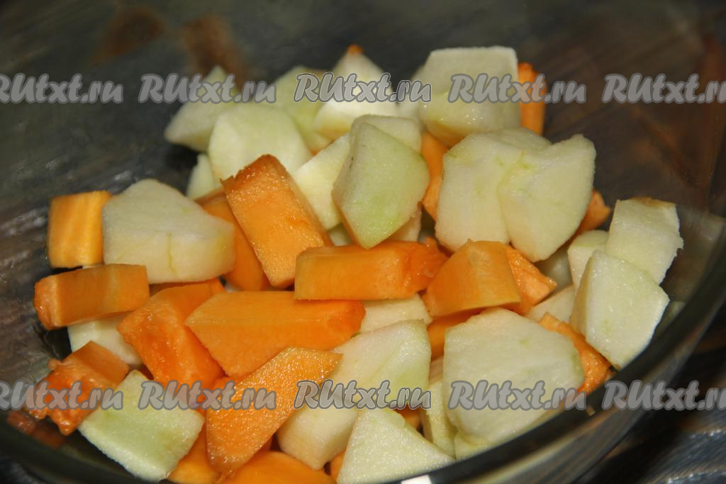 Подготовить продукты. Для этого блюда нам понадобится 200 грамм яблок, очищенных от кожуры и семян, и 200 грамм тыквы, очищенной от кожуры и семечек.