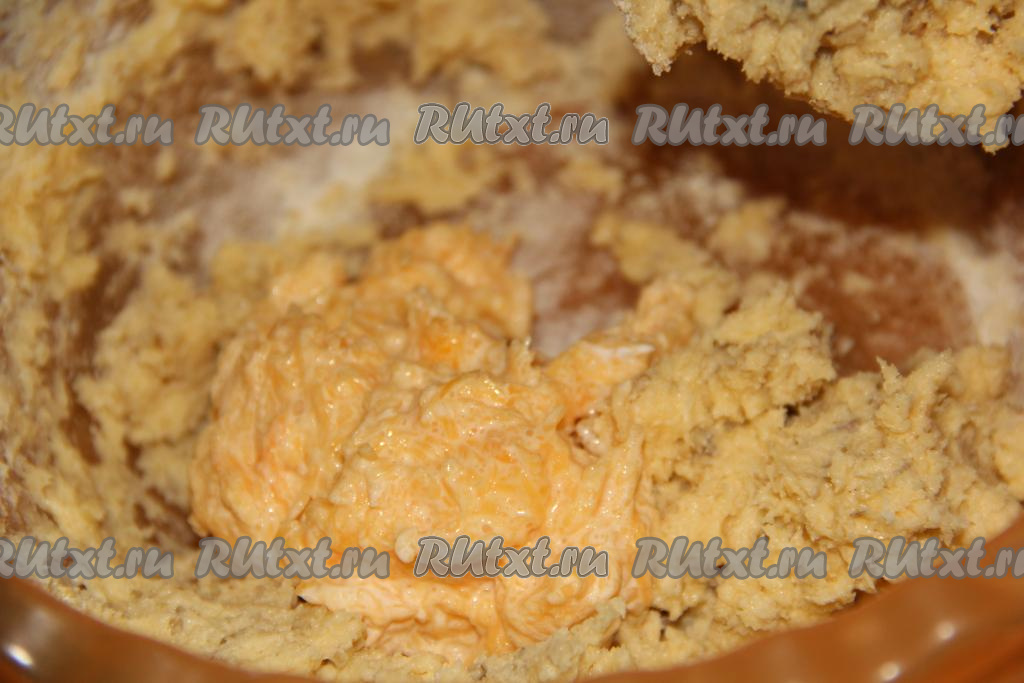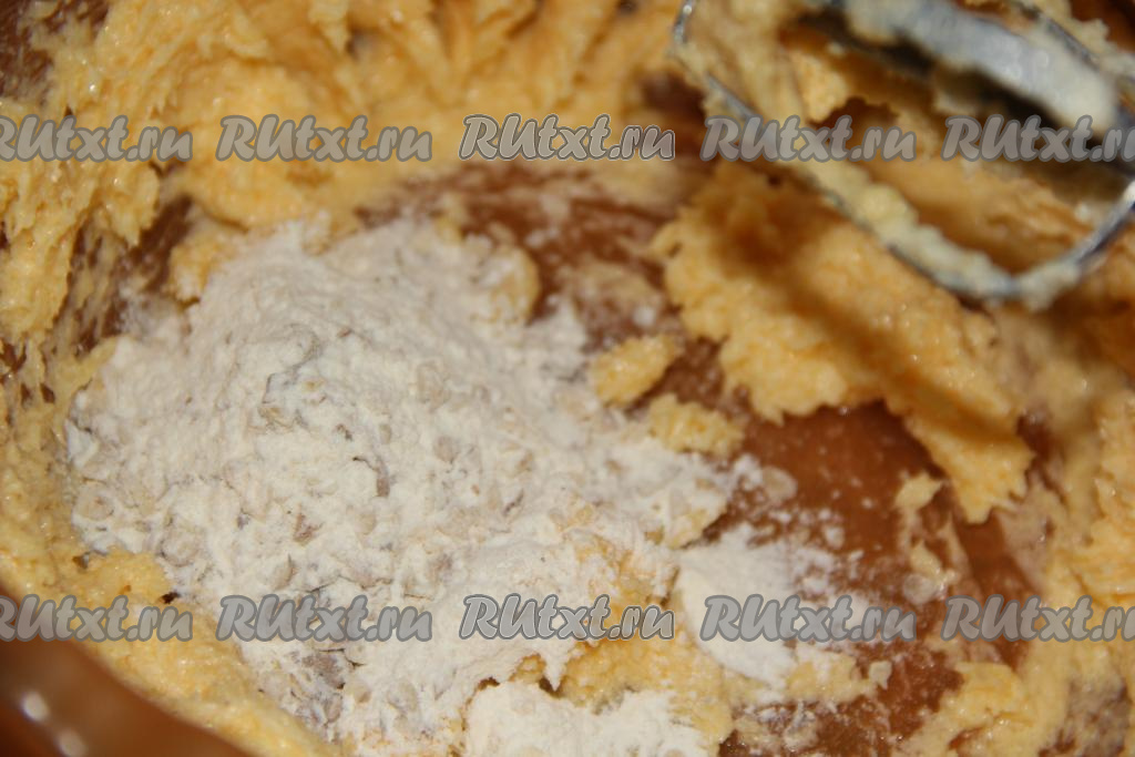 Миксером взбить мягкое сливочное масло с сахаром. Затем добавить яичные желтки и ещё раз взбить, масса должна стать однородной. Далее всыпать мучную смесь.