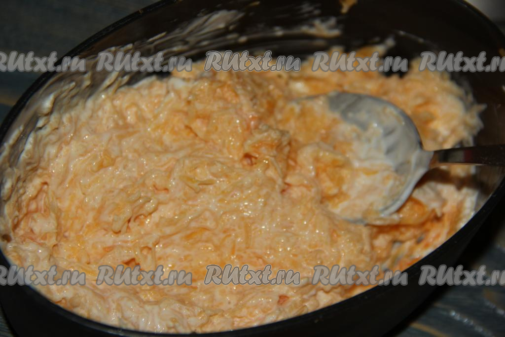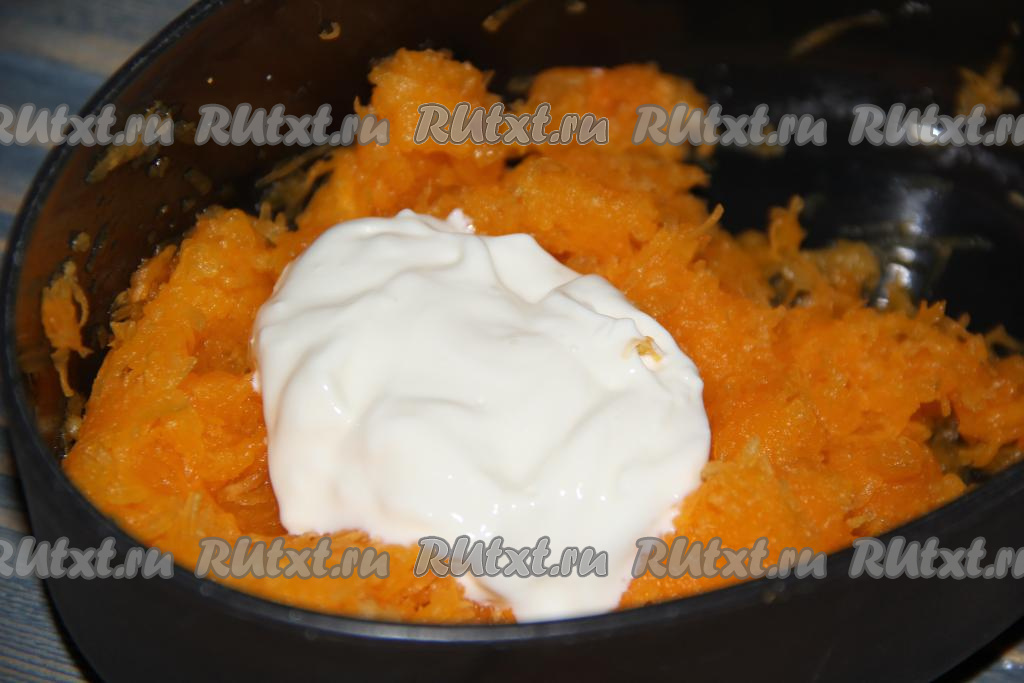 К натертой тыкве выложить сметану.