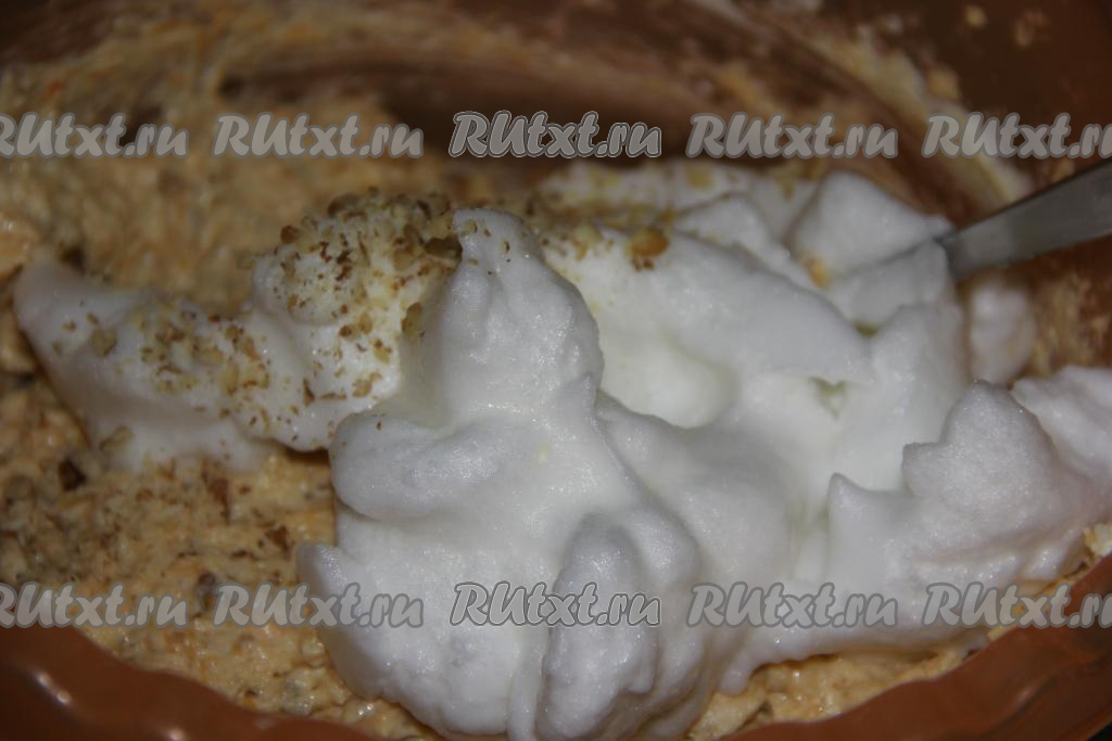 Яичные белки взбить до стойких пиков и добавить в тесто.