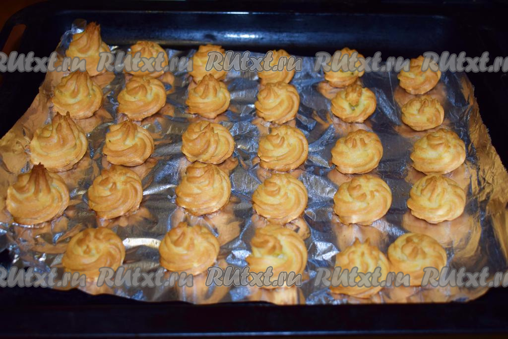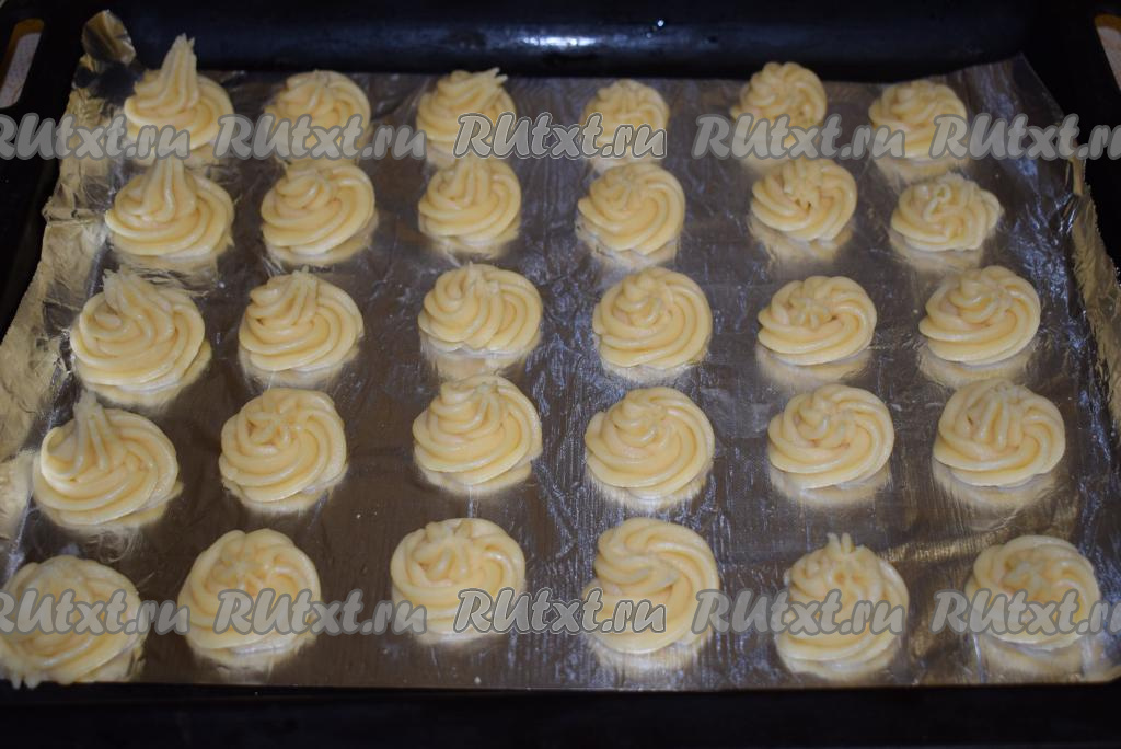 Далее перекладываем тесто в кондитерский мешочек и аккуратно при помощи фигурной насадки выдавливаем тесто на противень, застеленный фольгой или пергаментом. Я делала профитроли диаметром 3,5-4 см, из указанного количества ингредиентов у меня получилось 55 штук.