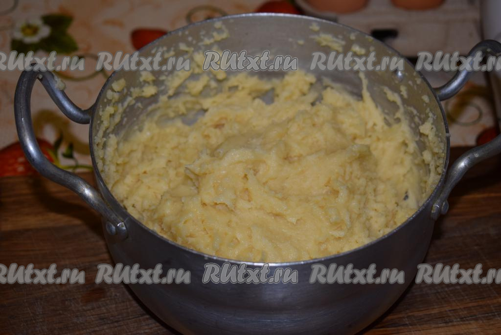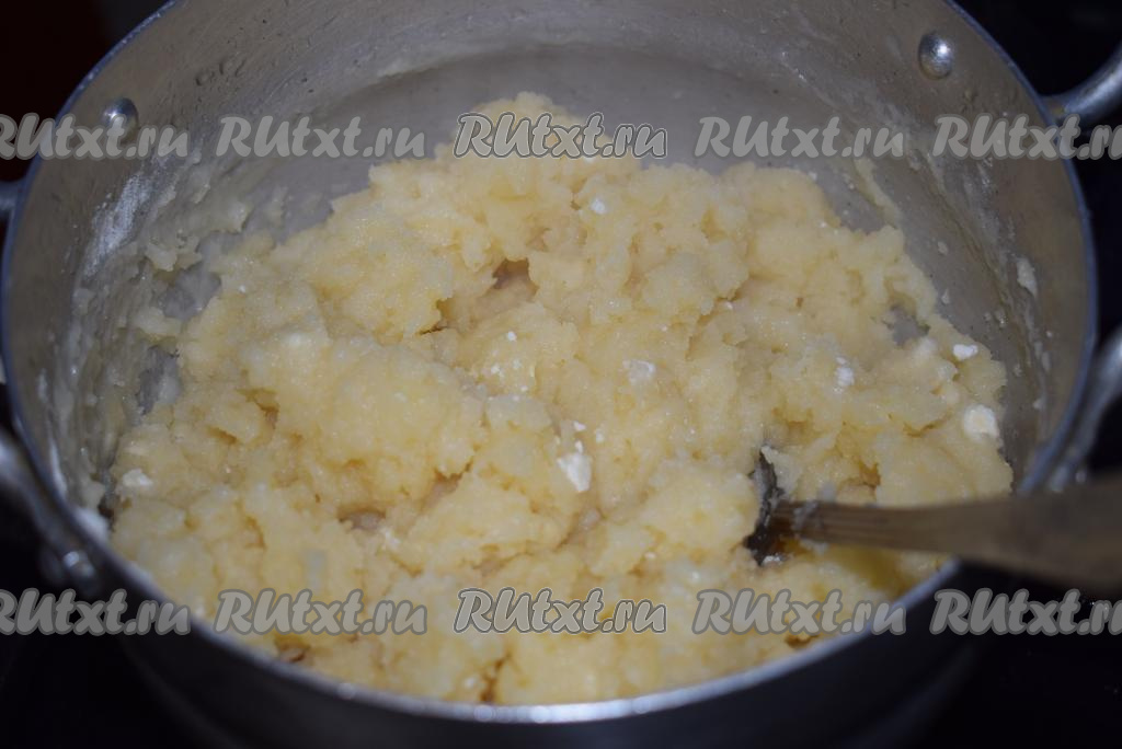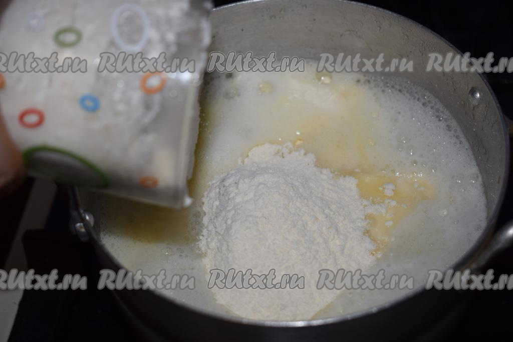 Осторожно, чтобы не обжечься, непрерывно перемешивая ложкой, замешиваем заварное тесто, провариваем, перемешивая, 3-4 минуты. Постепенно тесто начнёт густеть.