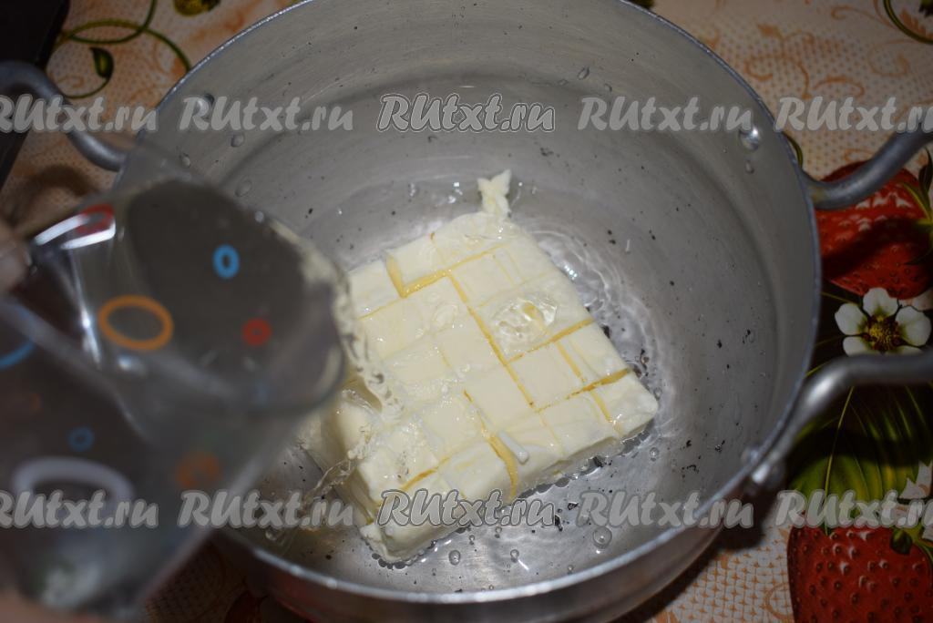 Сливочное масло нарежем кубиками в небольшую толстостенную кастрюльку, добавим соль и зальем водой.
