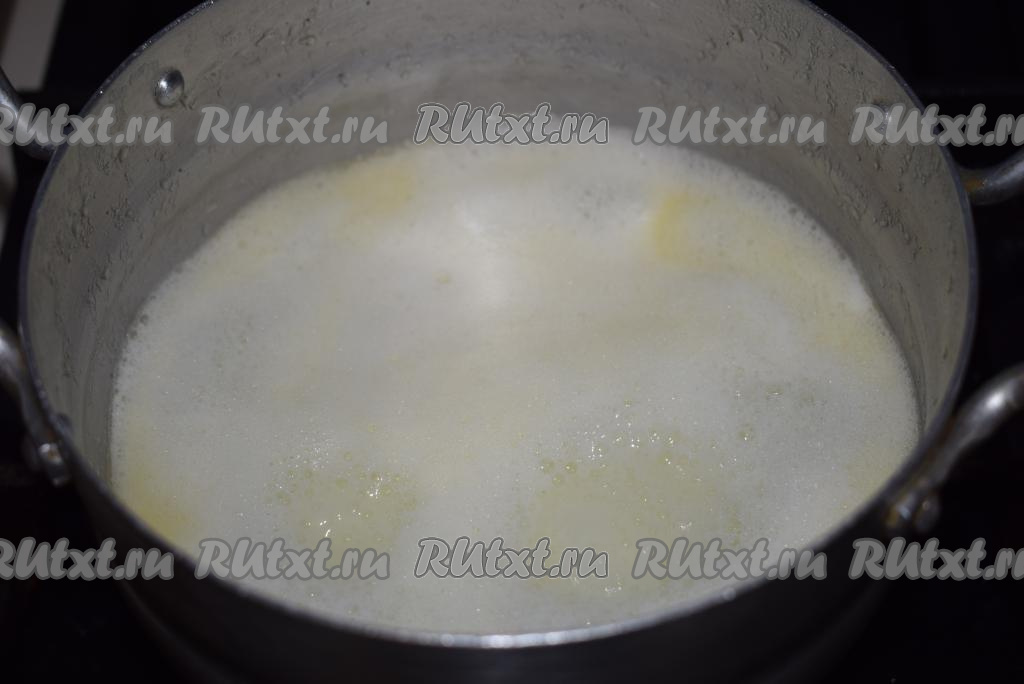 Поставим на огонь и доведем содержимое кастрюли до кипения и полного растворения сливочного масла.