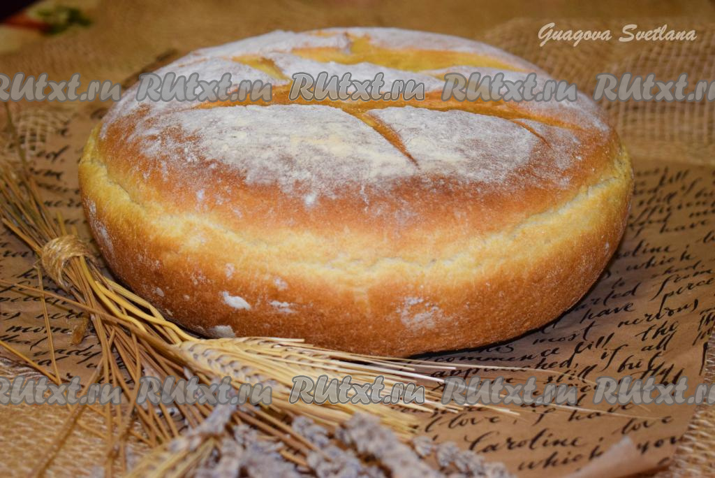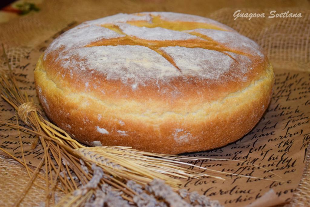 Теперь присыпаем сверху хлеб пшеничной мукой и, по желанию, острым ножом (или лезвием) делаем на поверхности теста надрезы. Ставим подготовленный кукурузный хлеб в разогретую духовку и выпекаем 45-50 минут при температуре 180 градусов (до зарумянивания).