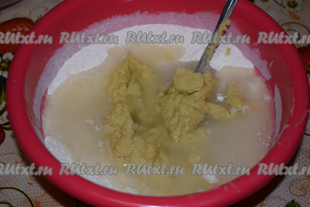 Затем к смеси пшеничной муки и дрожжей добавляем теплую воду и остывшую заваренную кукурузную муку, замешиваем тесто вначале ложкой, а затем руками.