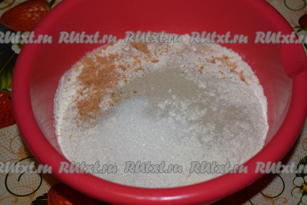 В глубокую миску насыпаем пшеничную муку, добавляем к ней дрожжи, сахар и соль (у меня чесночная соль со специями), перемешиваем до однородности.