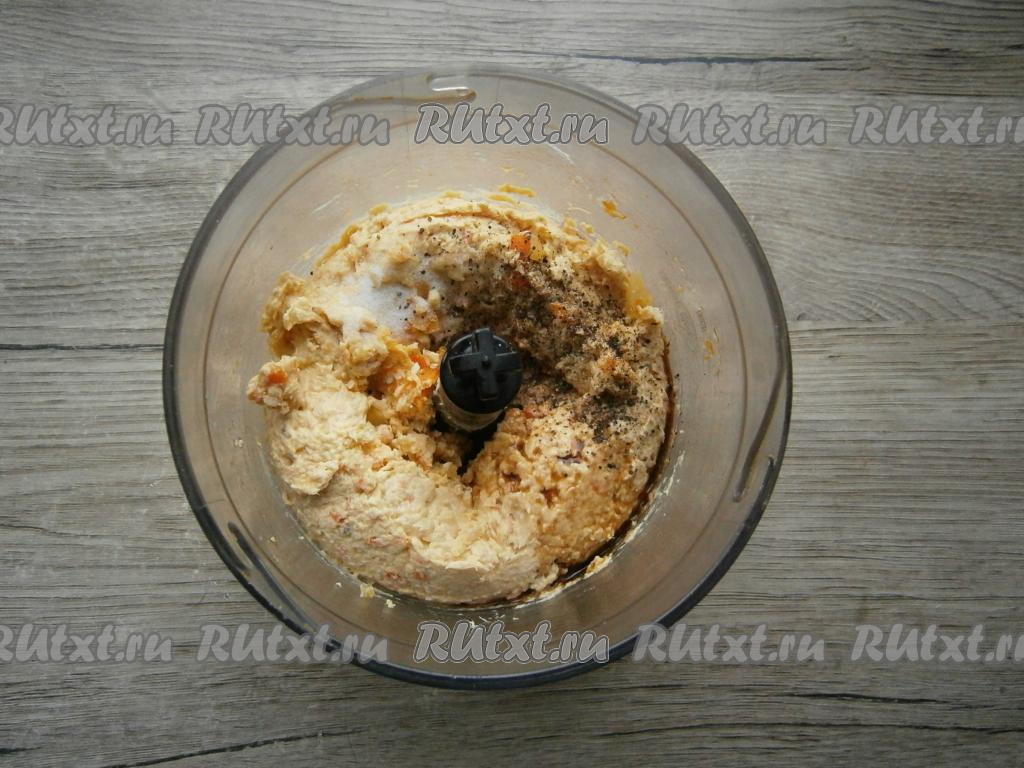 Измельчить все вместе до однородности, затем всыпать немного соли, черный молотый перец, влить соевый соус.