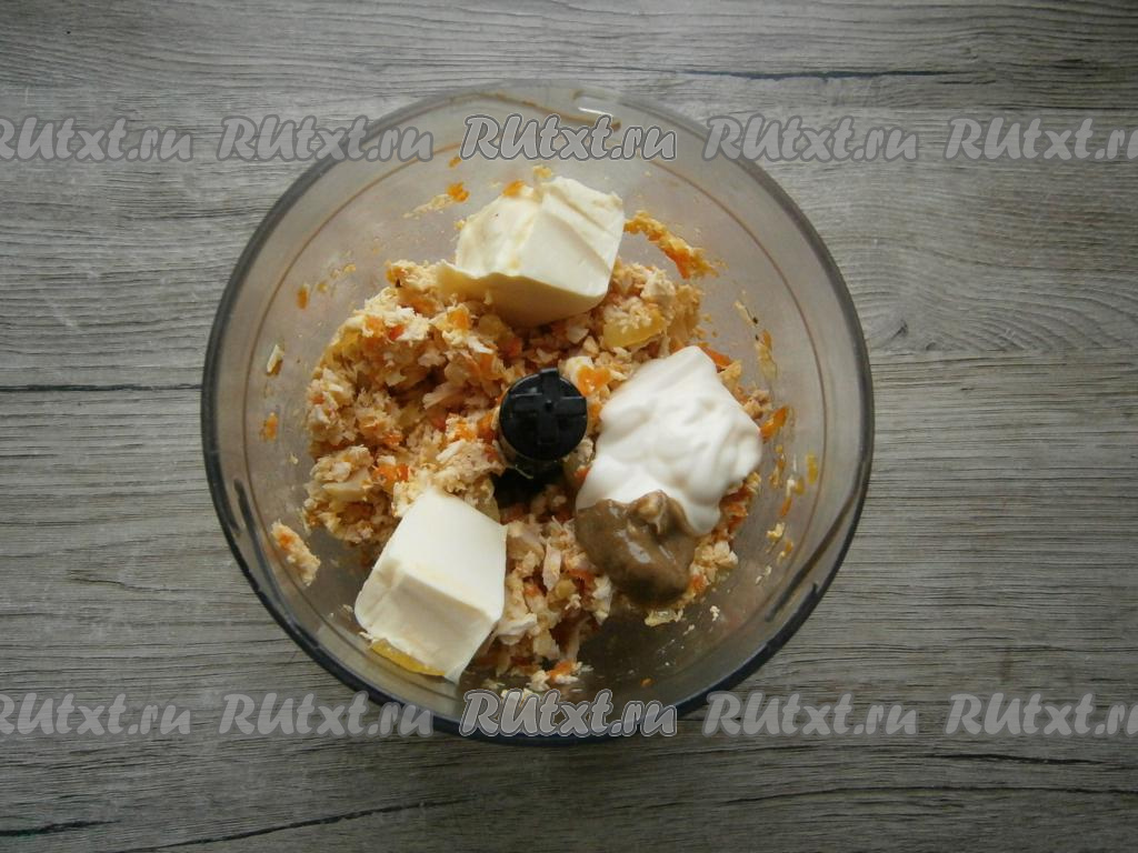 Немного измельчить мясо с овощами, добавить размягченное сливочное масло, майонез и горчицу.