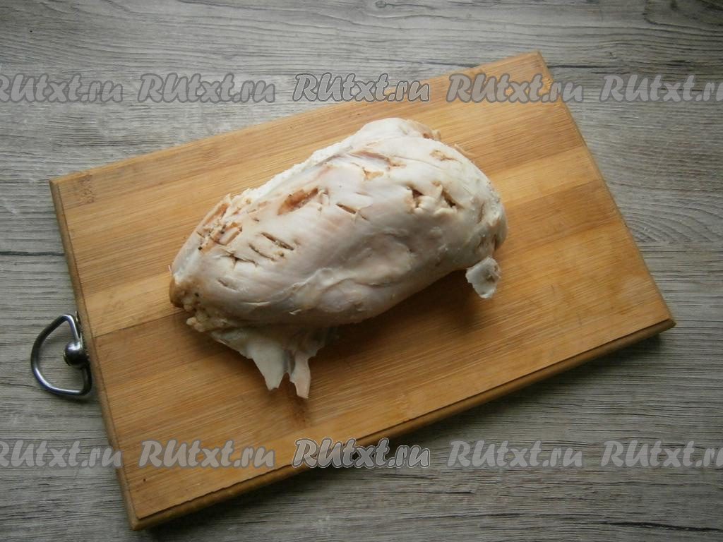 Куриное филе отварить в подсоленной воде около 35 минут или запечь в разогретой духовке при температуре 180 градусов около 50 минут, остудить.