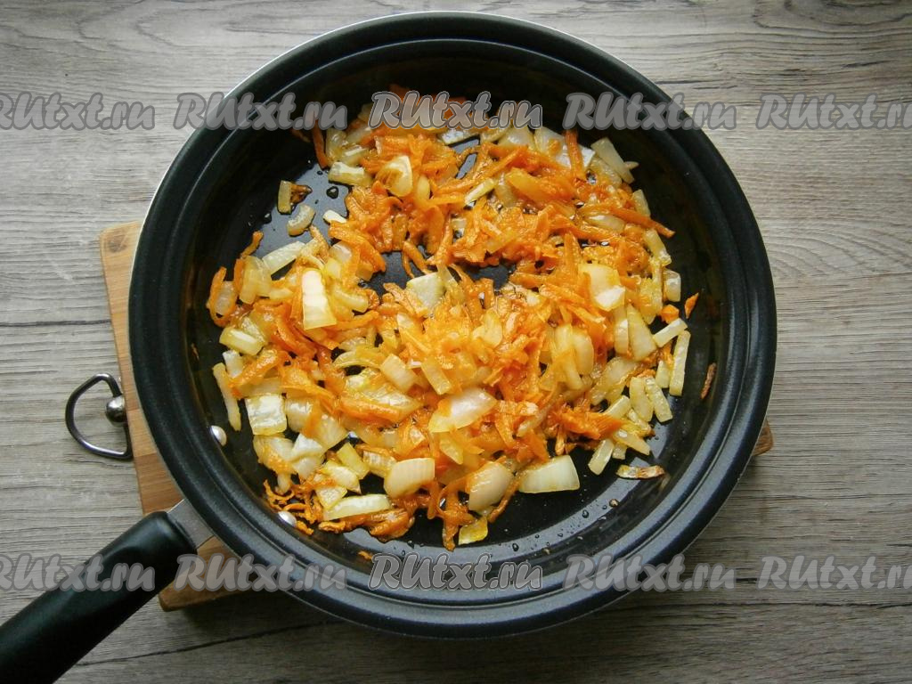 Обжарить лук с морковкой до мягкости (около 5 минут) на среднем огне, помешивая.
