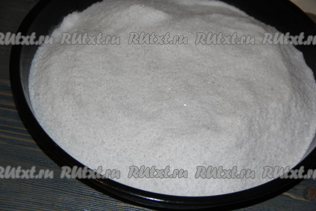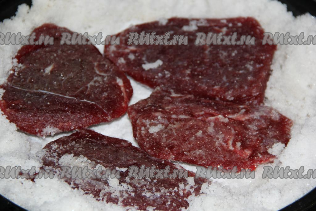 На противень или поднос с высокими бортами равномерно насыпать соль (примерно, 700 грамм). На соль выложить куски мяса. Мясо выкладывать ровно, так как во время обезвоживания оно станет плотным. Поверх кусочков мяса насыпать столько соли, чтобы мясо было не видно из-под солевой шубы. В таком виде поставить ёмкость с мясом в холодильник на сутки.