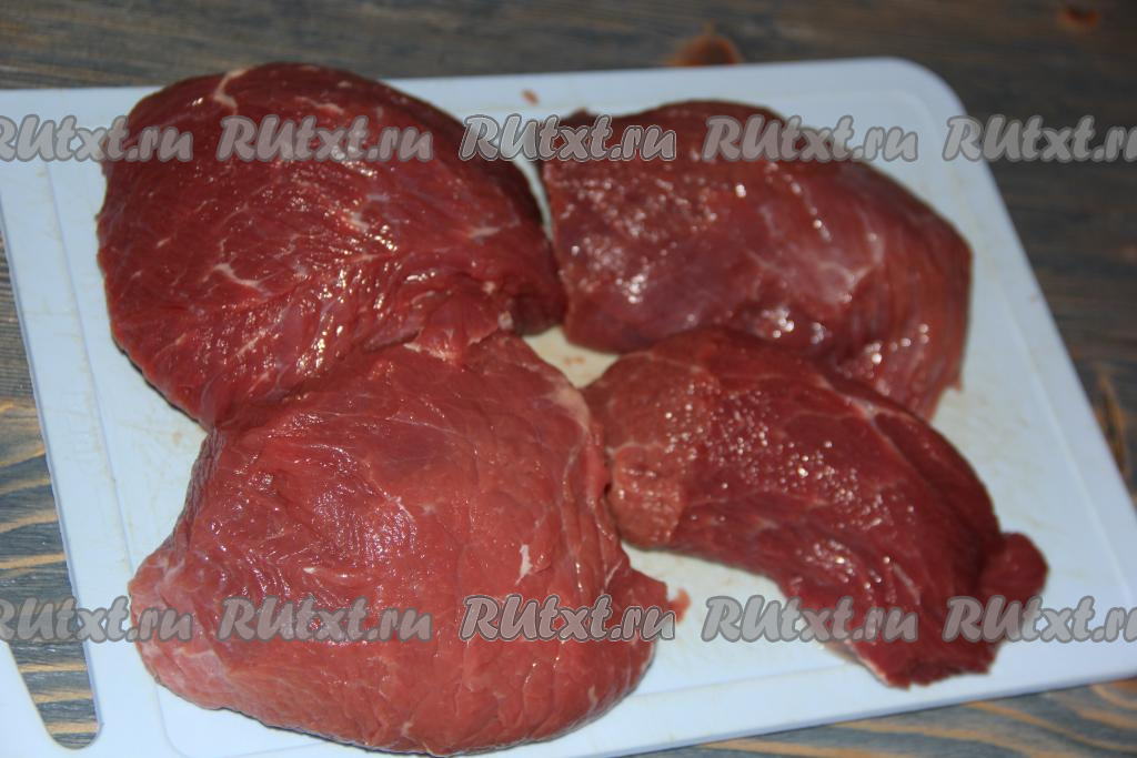 Кусок говяжьей вырезки разделить на 3-4 части, удалить прожилки жира и сухожилий. В итоге у нас получится несколько кусочков общей массой 800 грамм.