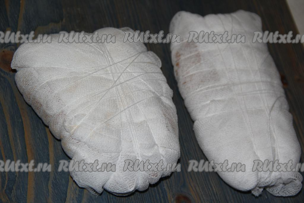 Затем выложить мясо на марлю. Марлю лучше взять не медицинскую, без запаха. Можно использовать белую хлопковую ткань.