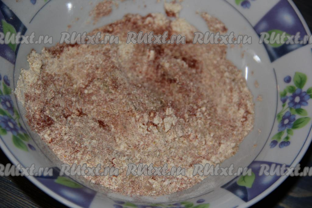 Перемешать все специи и влить воду. Воду вливать понемногу, тщательно перемешивая массу лопаткой. Понадобится, примерно, 50-70 мл воды.