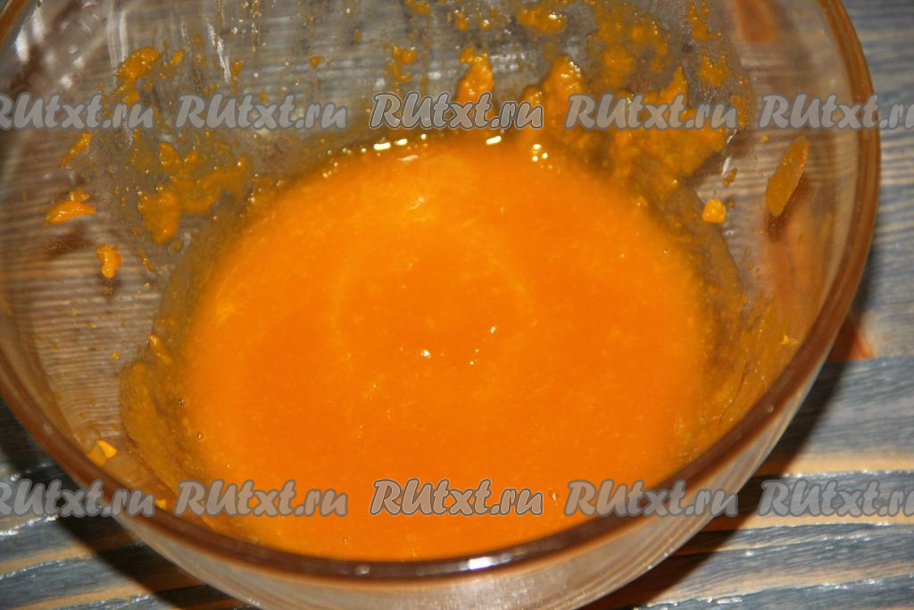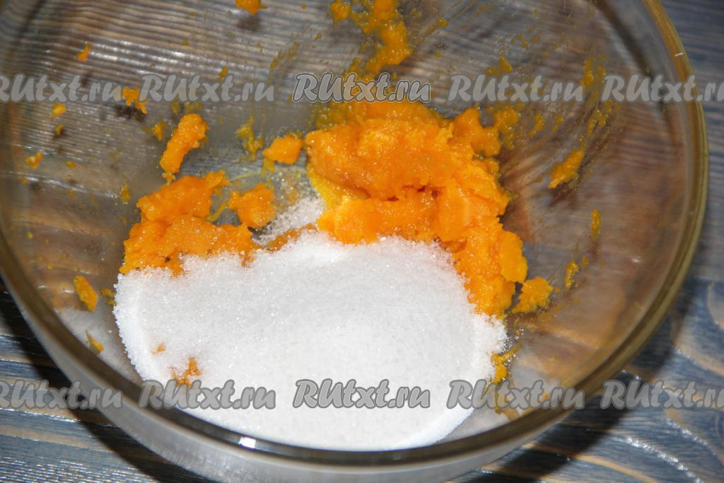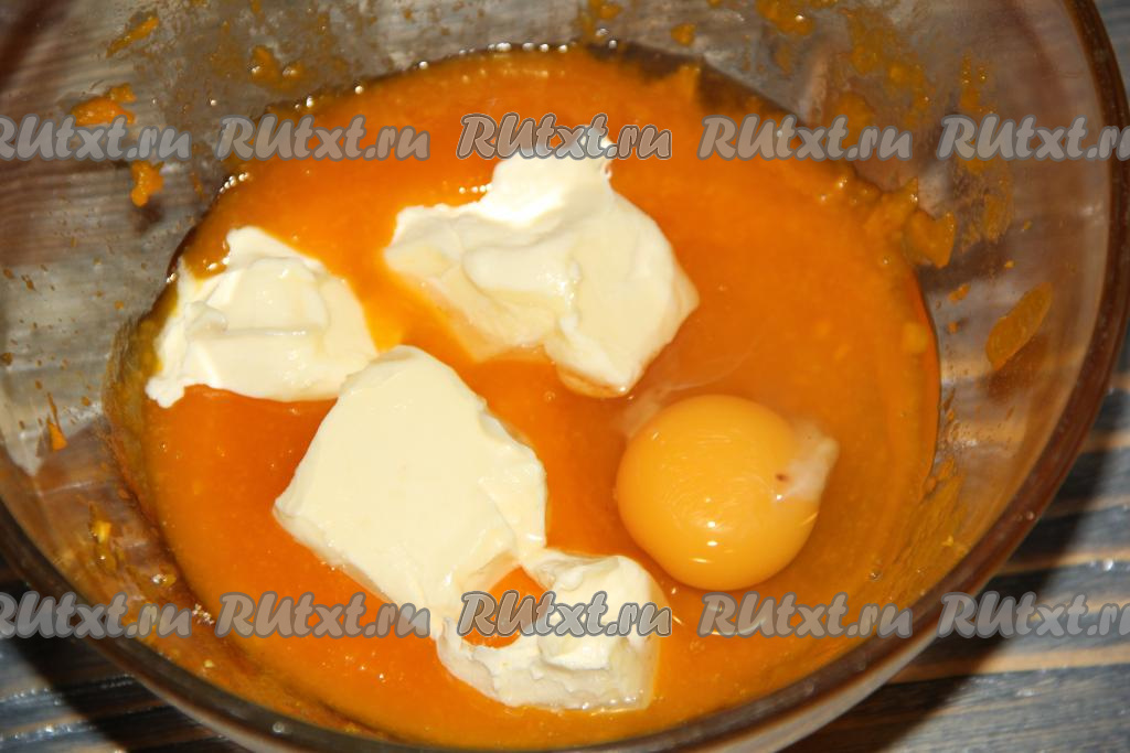 К тыквенному пюре с сахаром добавить яйцо и размягченное сливочное масло, нарезанное на кусочки.
