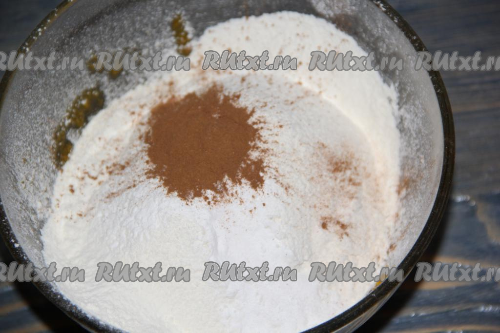Далее всыпать просеянную муку, соль, соду, разрыхлитель и корицу.