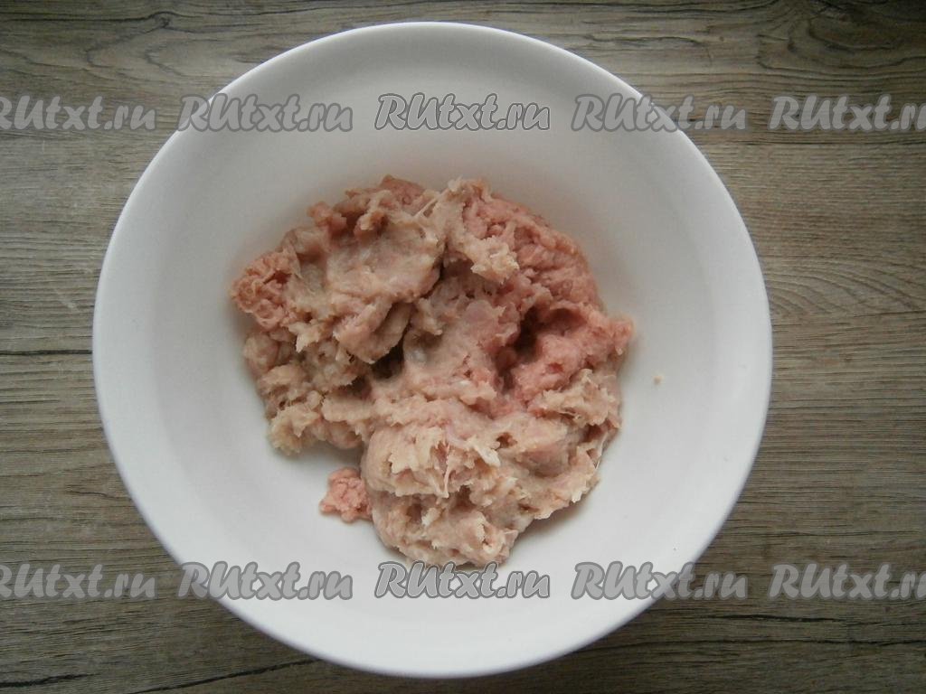 Измельчить мясо с луком до состояния фарша. Мясо с луком можно перекрутить и на мясорубке. Переложить фарш в миску.