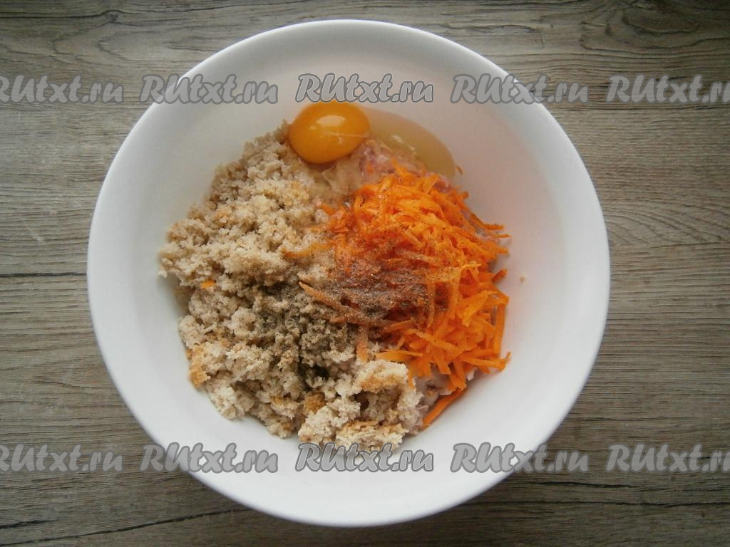 Добавить очищенную морковь, натертую на крупной терке, и предварительно размоченный в воде и отжатый серый хлеб.