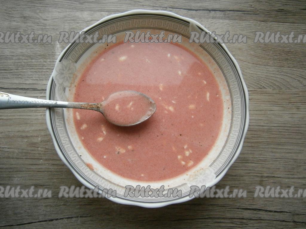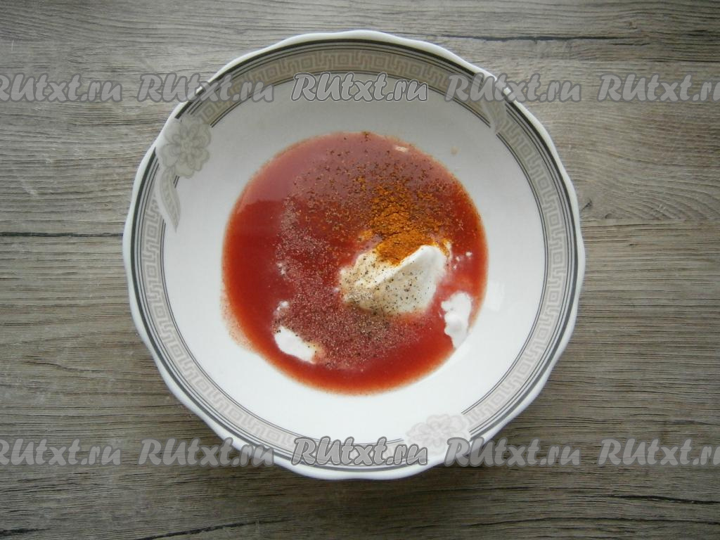 Половину стакана томатного сока смешать до однородности со сметаной, солью, приправой и 0,5 чайной ложки чесночного перца.