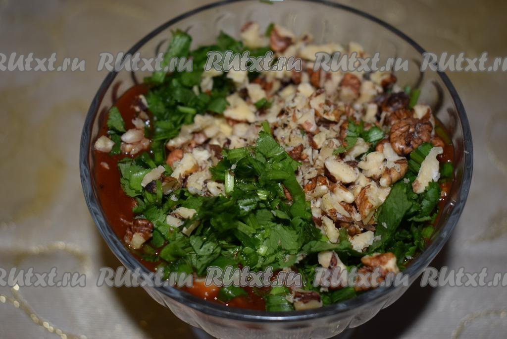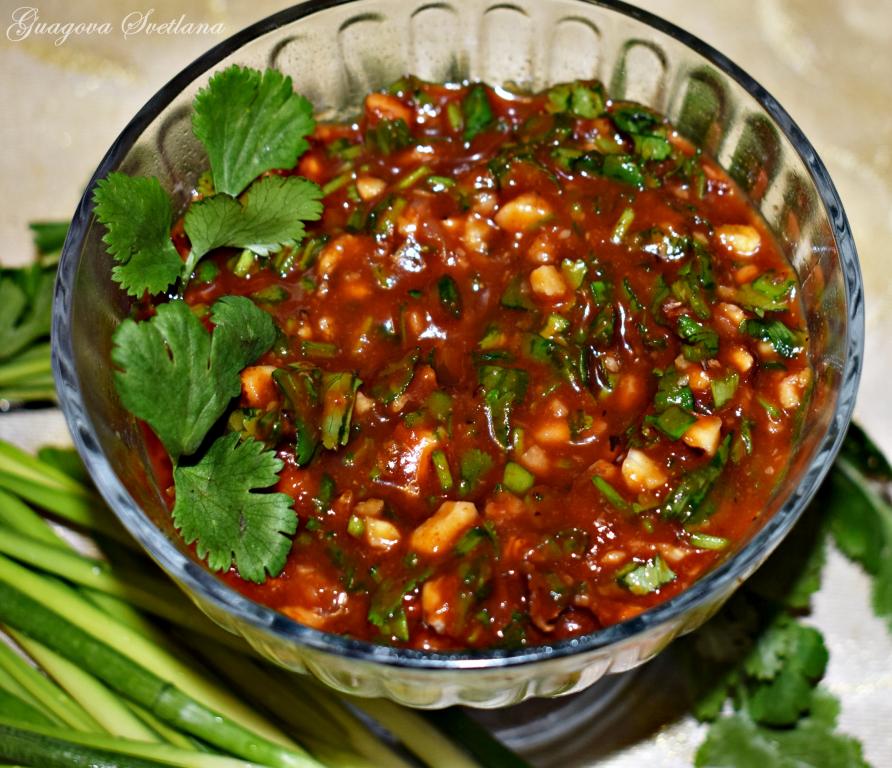 В кетчуп с чесноком добавляем кинзу, зелёный лук, орехи, свежемолотый перец, любимые специи и, если необходимо, то подсаливаем по вкусу, хорошо перемешиваем.