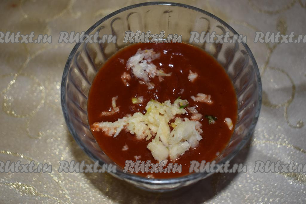 Пропустим чеснок через пресс и добавим в кетчуп.