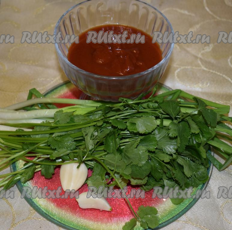 Отмерим нужное количество кетчупа. Вымоем лук и кинзу, очистим чеснок, орехи освободим от скорлупы.