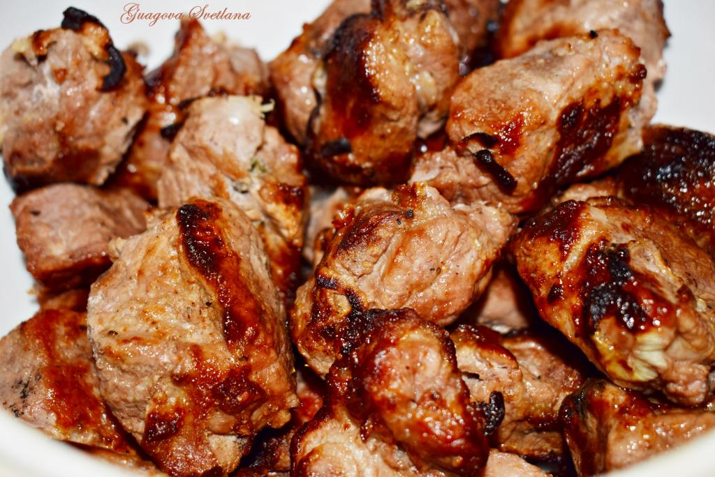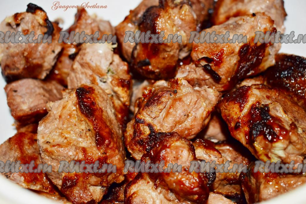 Готовый шашлык снимаем с шампуров и подаем к столу горячим. Шашлык из свинины, приготовленный по этому рецепту, получается вкусным, нежным, очень сочным и ароматным. Лимон и лук в процессе маринования мяса придают кусочкам свинины неповторимый вкус!
