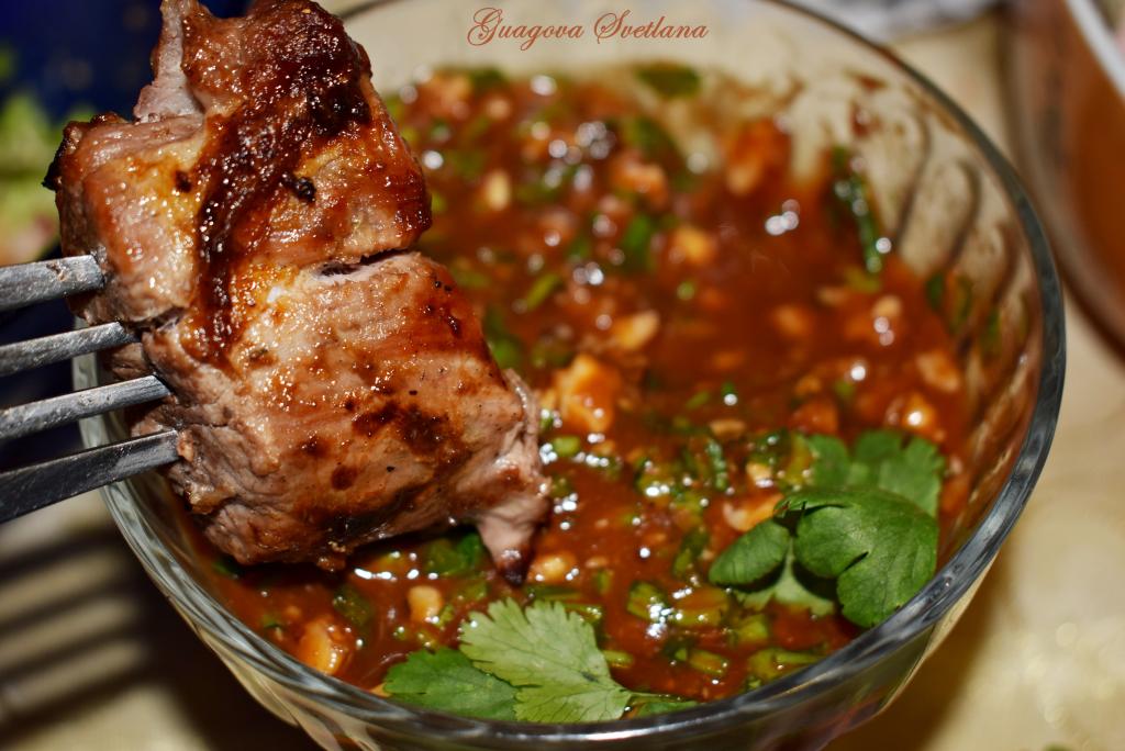 Я предпочитаю шашлык из свинины, замаринованной с лимоном и луком, подавать с томатным соусом с кинзой. Очень вкусно, непременно попробуйте!