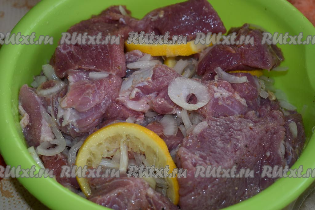Перемешаем кусочки свинины с лимоном и луком, оставим мариноваться на 5-8 часов при комнатной температуре. Можно оставить мясо мариноваться на ночь в холодильнике.