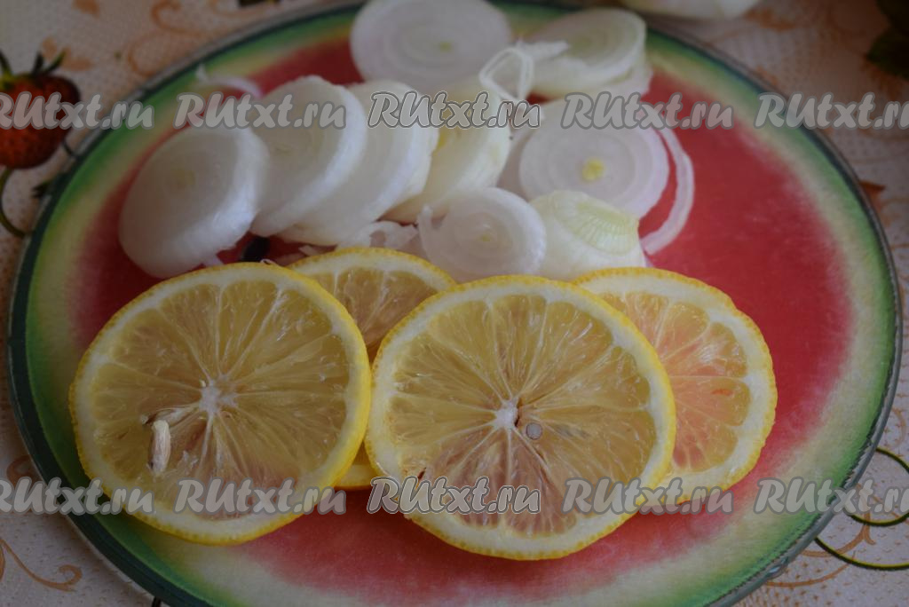 Репчатый лук очистим от кожуры и нарежем на тонкие кольца. Половину лимона нарежем на дольки. Из второй половины лимона нужно выжать сок прямо в миску с мясом.