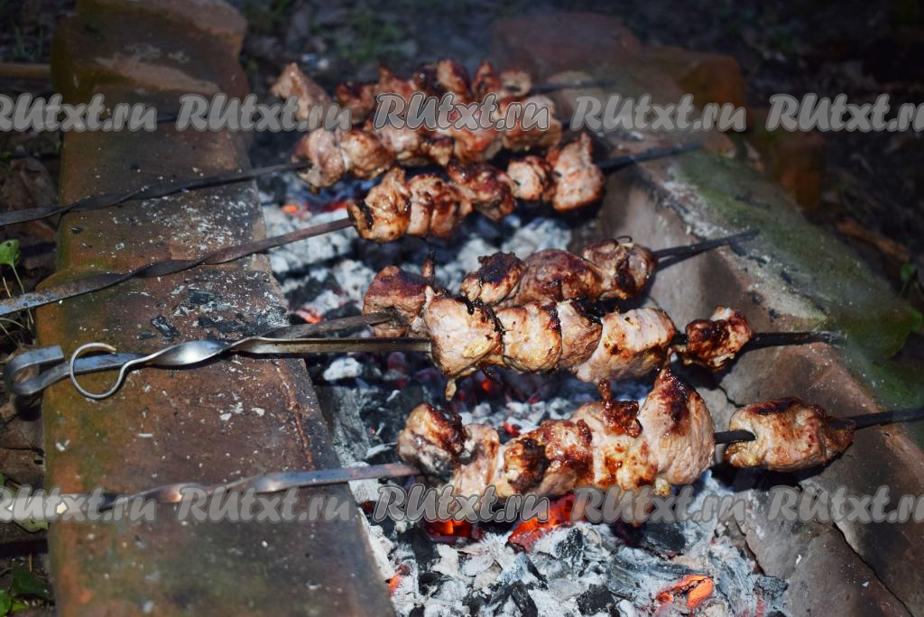 Замаринованные кусочки свинины нанизываем на шампуры и жарим на горячих углях (костёр должен предварительно хорошо прогореть, в нём уже не будет огня, а останутся только очень горячие угли). Несколько раз переворачиваем шампуры с мясом в процессе жарки, чтобы кусочки свинины прожарились со всех сторон. Следим, чтобы мясо не подгорало. Кусочки шашлыка из свинины должны получиться красивого румяного цвета. Шашлык будет готов, когда при разрезании кусочка из него будет выделяться прозрачный сок без примесей крови. Время приготовления шашлыка из свинины, замаринованной с лимоном и луком, у всех будет разным - оно зависит от температуры воздуха на улице, от количества и жара углей, плотности нанизывания мяса на шампуры, от величины нарезки мяса. В среднем на приготовление шашлыка уходит от 20 до 35 минут.