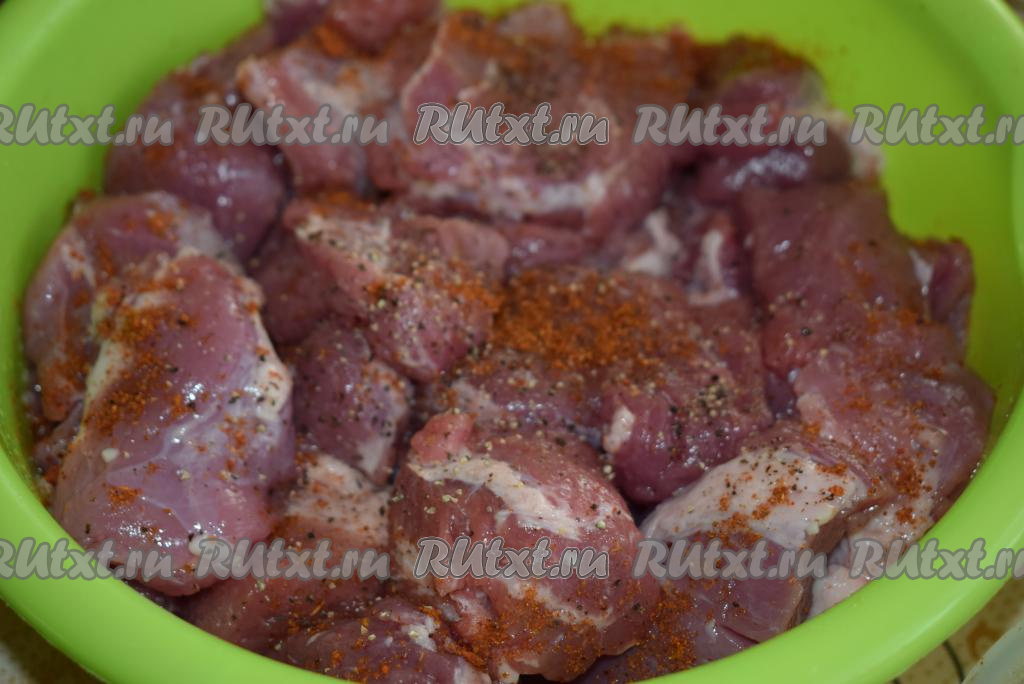 Нарежем подготовленное мясо на кусочки, примерно, равного размера, например, 4х4 см (нарезка мяса на кусочки одинакового размера позволит в дальнейшем шашлыку равномерно прожариться).
