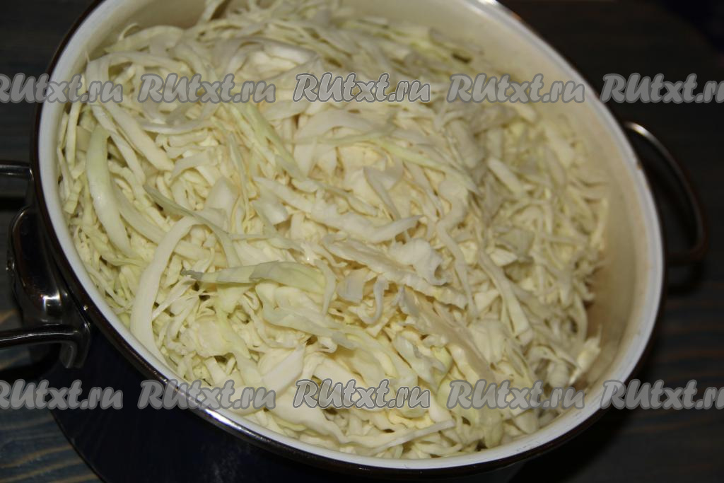 Для засолки лучше подходят сорта капусты позднего созревания, ведь у такой капустки плотные кочаны. Капусту нашинковать длинными полосками и поместить в большую кастрюлю. Я использовала кастрюлю объёмом 7 литров.
