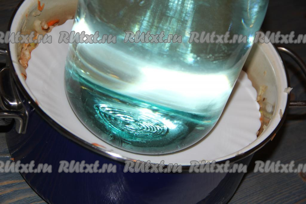 Накрыть капусту тарелочкой и поставить сверху банку с водой (у меня трёхлитровая банка) (как на фото) - таким образом капуста будет под гнётом. Оставить капусту на кухонном столе на 3-4 суток. Как только над тарелкой появится сок, убрать тарелку, проколоть капусту с помощью деревянной шпажки до дна кастрюли, снова накрыть тарелкой и сверху поместить банку с водой. Я прокалываю по 4 раза в сутки.