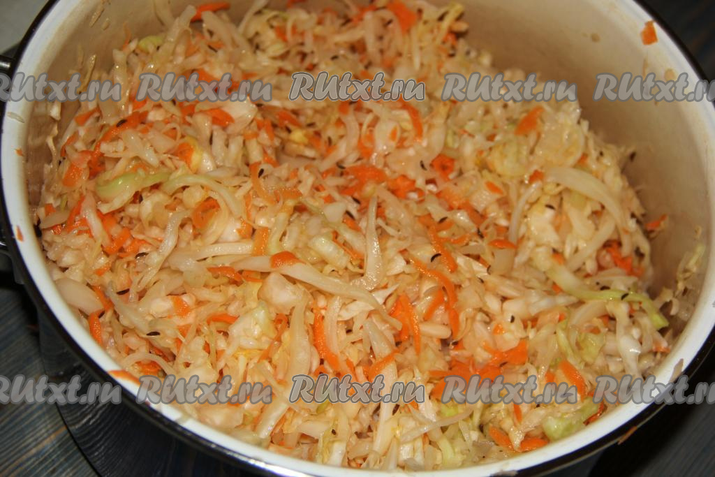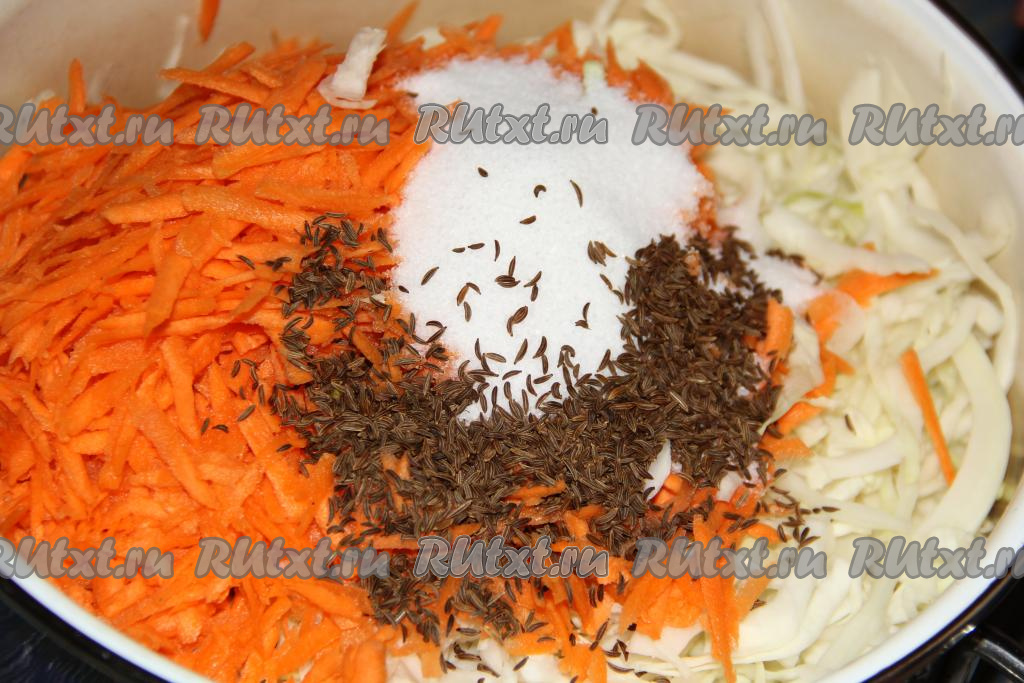 Морковь очистить и натереть на крупной тёрке. Добавить натёртую морковь, соль и тмин в кастрюлю к капусте.