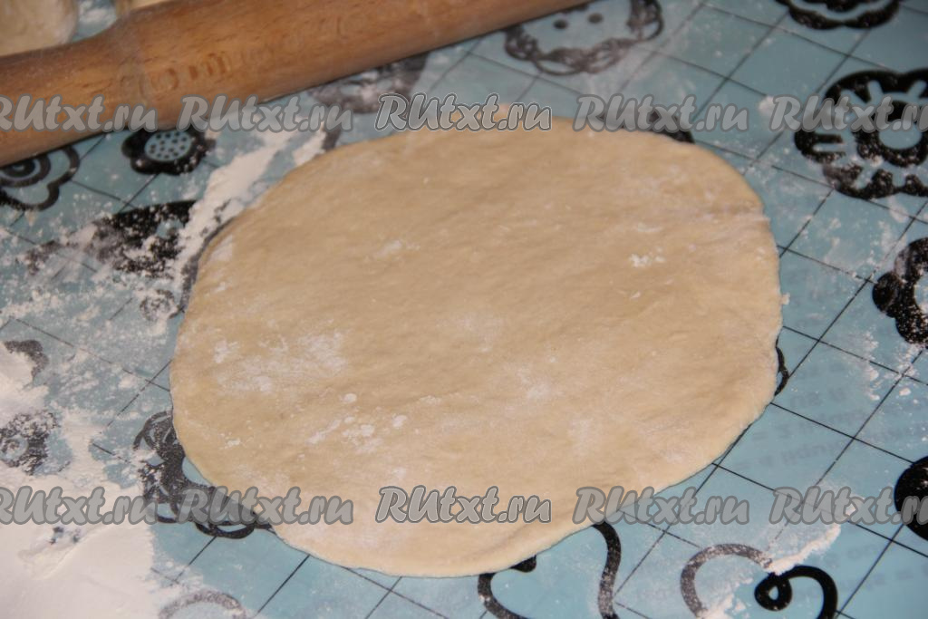 На столе, присыпанном мукой, раскатать каждую часть теста скалкой в круг.