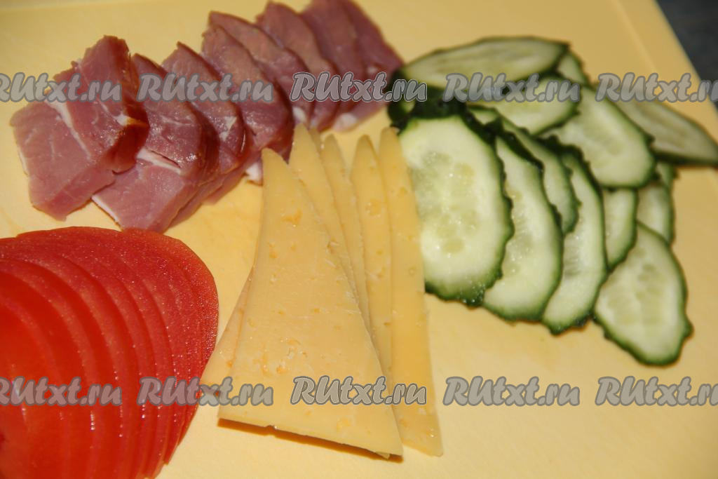 Начинку для бутербродов можно взять по желанию. Я взяла кусочки колбасы, сыра, помидоров и огурцов.