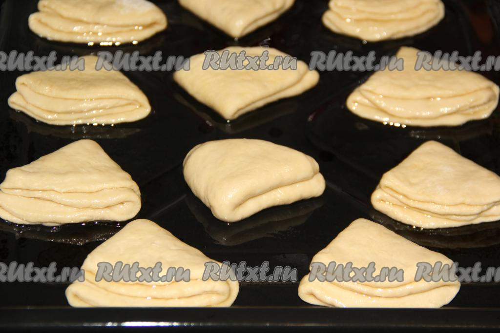 Край круга смазать маслом и сложить ещё раз (как на фото), выложить заготовки на небольшом расстоянии друг от друга на противень, смазанный маслом.