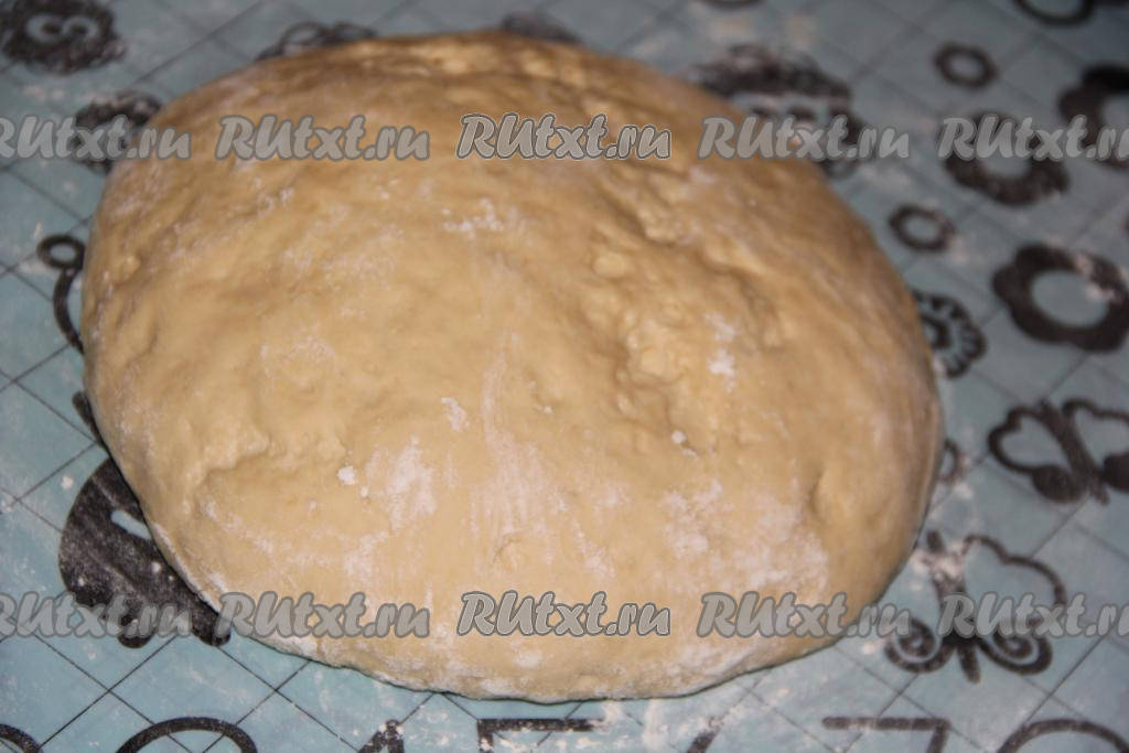 Приготовить тесто, для этого дрожжи развести в 50 мл тёплой воды (температура не более 40 градусов) и оставить на 10 минут (дрожжи запенятся). Затем соединить тёплый кефир, дрожжевую смесь, сахар и соль, перемешать, добавить муку и замесить тесто, в конце замеса влить растительное масло. Хорошо вмешать масло в тесто, тесто получится мягким, не липнущим к рукам. Оставить тесто в миске на 1,5 часа в теплом месте. Миску накрыть полотенцем или плёнкой. Готовое тесто выложить на стол, обмять и оставить отдохнуть на 20 минут.